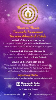 Con questo spirito, al Museo della Radio e della Televisione RAI abbiamo immaginato un trittico di serate speciali, dove la musica incontra il patrimonio culturale del Museo e lo illumina da nuove prospettive: la vibrazione della voce, l’armonia delle cellule, il racconto musicale del Natale.