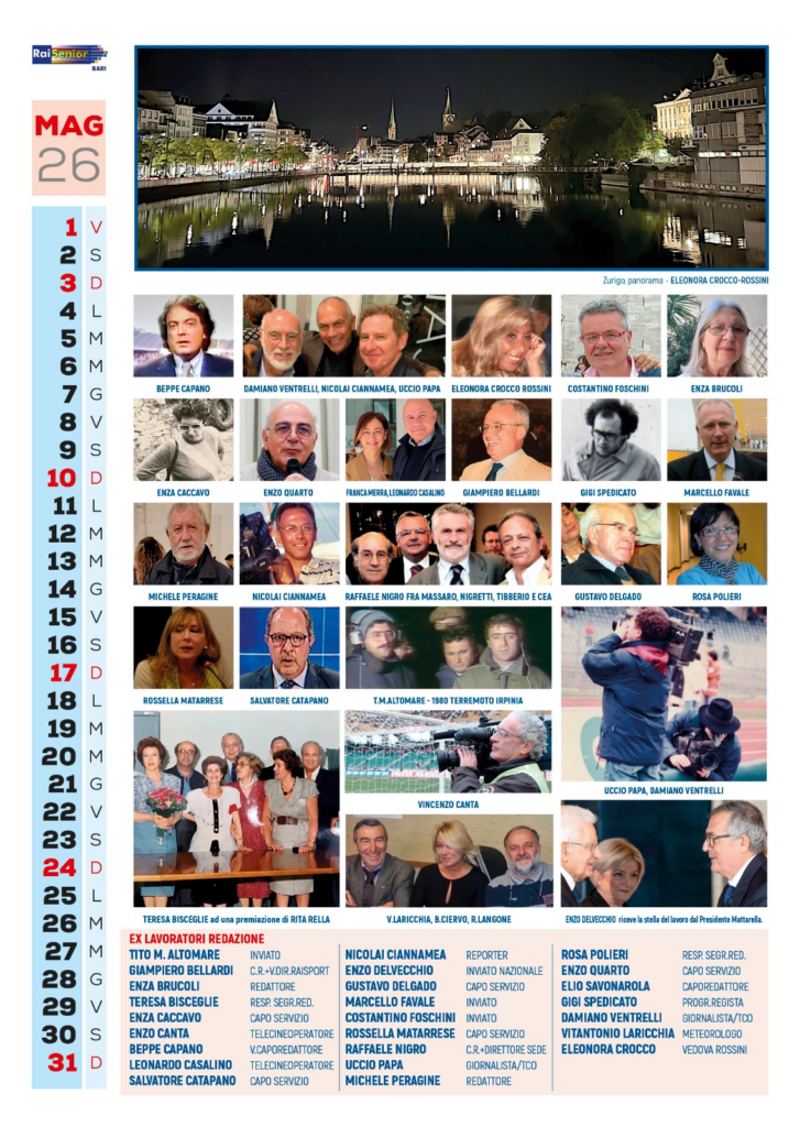 Per ognuno di questi settori che ritroverete nel nostro calendarii ci sono poi approfondimenti sugli attuali organici, gli elenchi illustrati degli ex lavoratori di settore ad oggi iscritti a Raisenior Bari, ed articoli che vogliono rappresentare l’unicità del lavoro in questa nostra azienda che è la RAI.