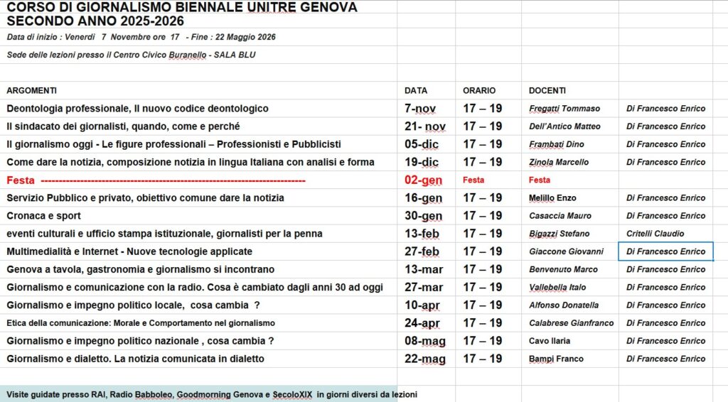 Come docenti cì sono professionisti della carta stampata (La Repubblica, Corriere della sera, Secolo XIX, Il Foglio) della radio e televisione ( RAI e TV Locali) e del web. Nel secondo anno, che è inizieto il 7 Novembre 2025, si darà la possibilità ai discenti di comporre articoli di vario genere e argomento e di visitare le sedi di testate giornalistiche della stampa della radio e della RAI regionale Ligure grazie all’evento ‘porte aperte’ . Sarà presentato il nuovo codice deontologico dei giornalisti dal Presidente Regionale dell’OdG Tommaso Fregatti e saranno toccati altri argomenti come il digitale, la gastronomia, l’etica e il ruolo del giornalismo nella politica, e cosa accade quando i giornalisti entrano in politica?”