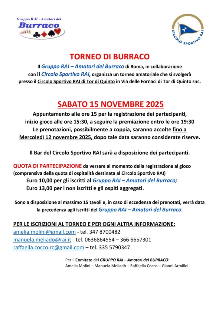 Il Gruppo RAI – Amatori del Burraco di Roma, in collaborazone con il Circolo Sportivo Rai, organizza per sabato 15 novembre 2025 un torneo.