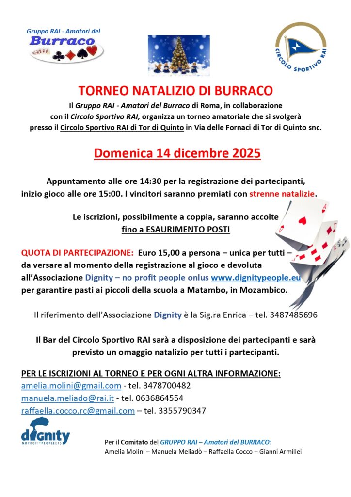Il Gruppo RAI – Amatori del Burraco di Roma, in collaborazone con il Circolo Sportivo Rai, organizza per domenica 14 dicembre 2025 un torneo.