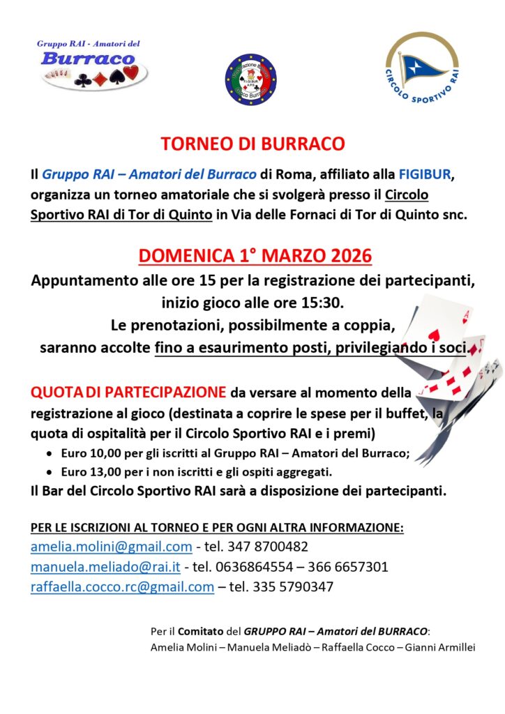 Il Gruppo RAI – Amatori del Burraco di Roma, affiliato alla FIGIBUR, organizza un torneo amatoriale che si svolgerà presso il Circolo Sportivo RAI di Tor di Quinto in Via delle Fornaci di Tor di Quinto snc.