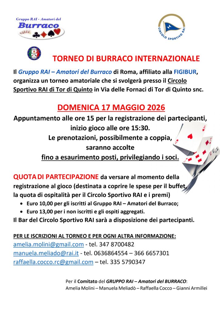 Il Gruppo RAI – Amatori del Burraco di Roma, affiliato alla FIGIBUR, organizza un torneo amatoriale che si svolgerà presso il Circolo Sportivo RAI di Tor di Quinto in Via delle Fornaci di Tor di Quinto snc.