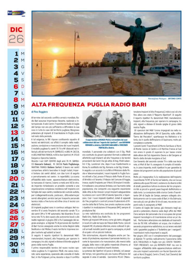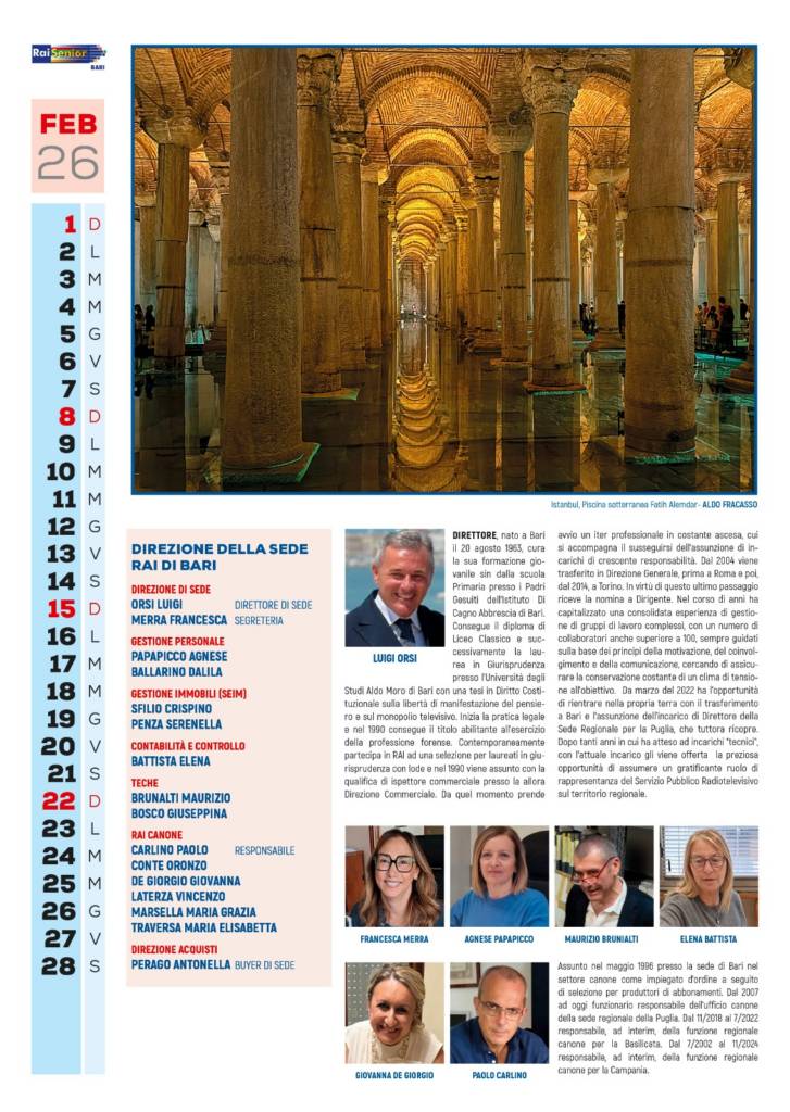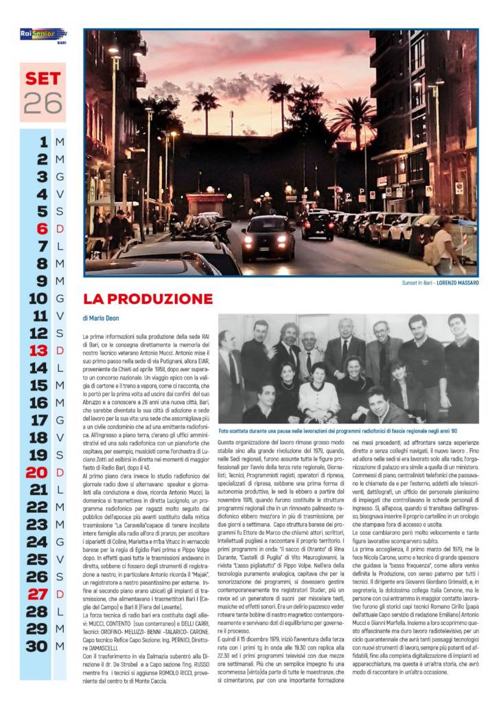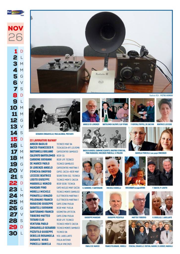 Per ognuno di questi settori che ritroverete nel nostro calendarii ci sono poi approfondimenti sugli attuali organici, gli elenchi illustrati degli ex lavoratori di settore ad oggi iscritti a Raisenior Bari, ed articoli che vogliono rappresentare l’unicità del lavoro in questa nostra azienda che è la RAI.