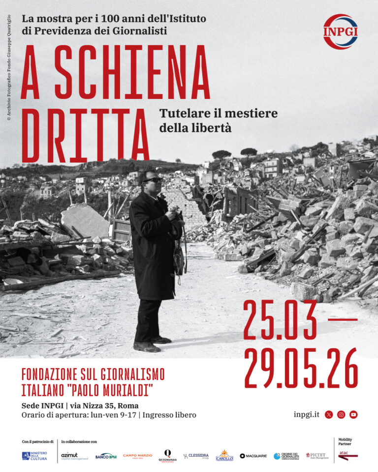 Il primo è l’inaugurazione della mostra A schiena dritta. Tutelare il mestiere della libertà”, inaugurata il 24 marzo 2026 (ore 18.00) nella Fondazione sul giornalismo italiano “Paolo Murialdi” ,in via Nizza 35 a Roma e realizzata grazie alla disponibilità offerta del direttore della Fondazione Giancarlo Tartaglia, storico del gionalismo italiano e protagonista indimenticabile della grande famiglia dei giornalisti italiani.