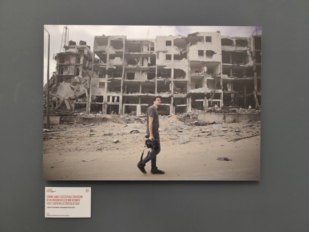 Tra le foto più significative all’entrata della mostra anche quella che ritrae e ricorda un altro eroe del giornalismo italiano, Simone Camilli, (suo padre Pierluigi era stato uno dei pionieri del TG1 e poi condirettore della TGR RAI insieme ad Angela Buttiglione direttore di testata), morto sulla Striscia di Gaza per l’esplosione improvvisa di un ordigno mentre lui stava seguendo le operazioni di disinnesco, storia anche la sua di grande civismo e di immensa dedizione professionale verso questo mestiere.